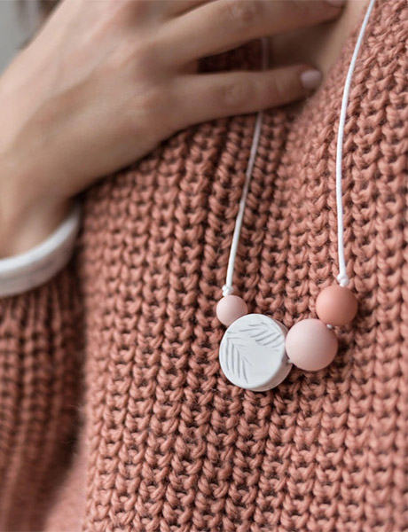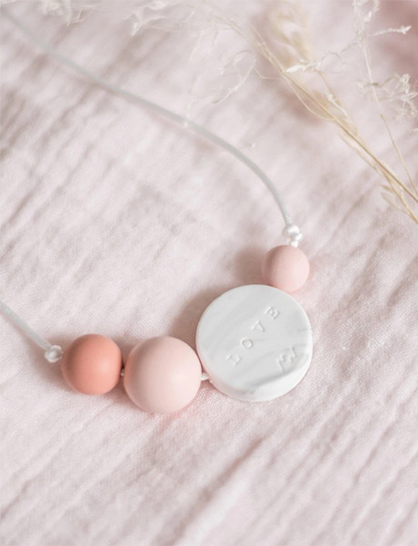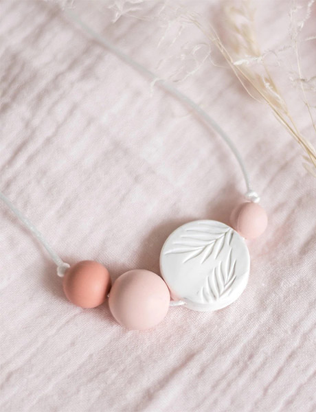 Le collier d’allaitement Palm Sunrise rose de Minty Wendy est idéal pour occuper bébé lors de la tétée.